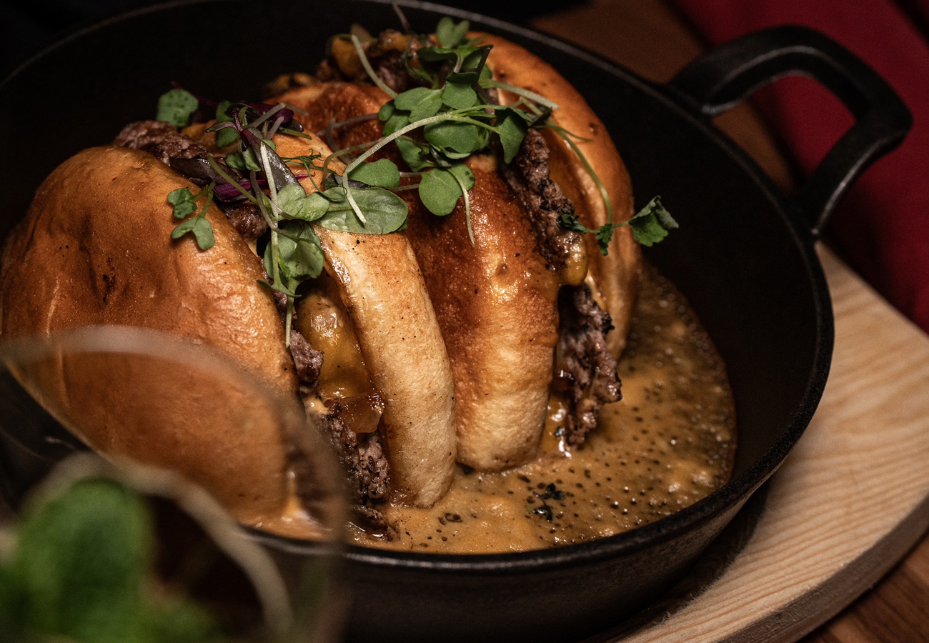 WAGYU SMASH BURGER, JAPANESE BEER CHEESE, CARAMELIZED ONIONS, SHISO GREENS, YUZU KOSHO AIOLI